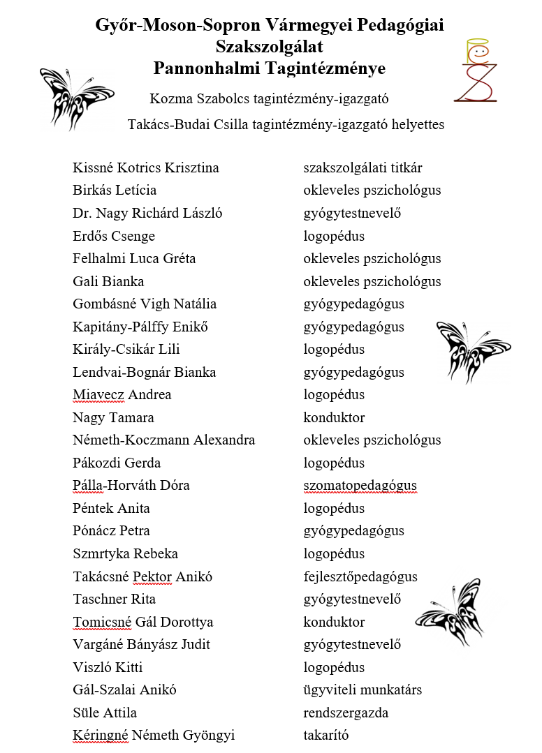 | Főállású munkatársak | Szakképesítés, szakvizsga, egyéb tanfolyamok és ellátandó szakfeladat |